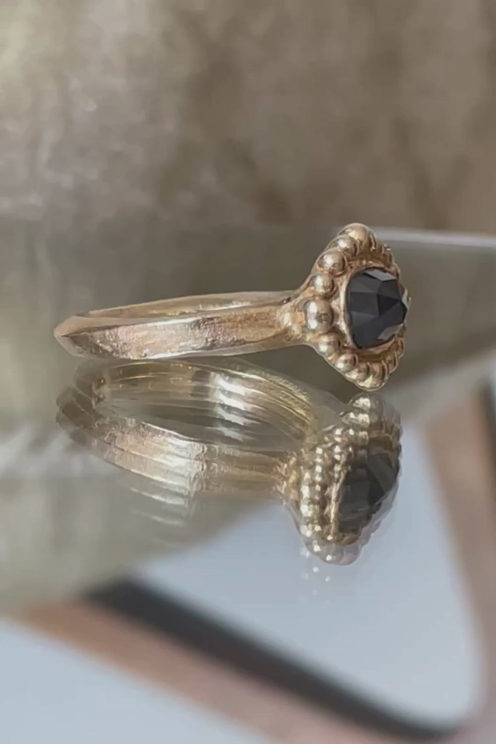 Ringen er massiv og lavet i 14 karat guld (585) på eget værksted i Danmark. Det rustikke udtryk og den kraftfulde ringskinne gør, at den egner sig perfekt som hverdagsring. I ringen er fattet en sort diamant på i alt 1,2 ct. Diamanten er slebet efter rosen-slibet. Kan også bestilles i hvidguld og 18 karat – mail for pris og leveringstid.